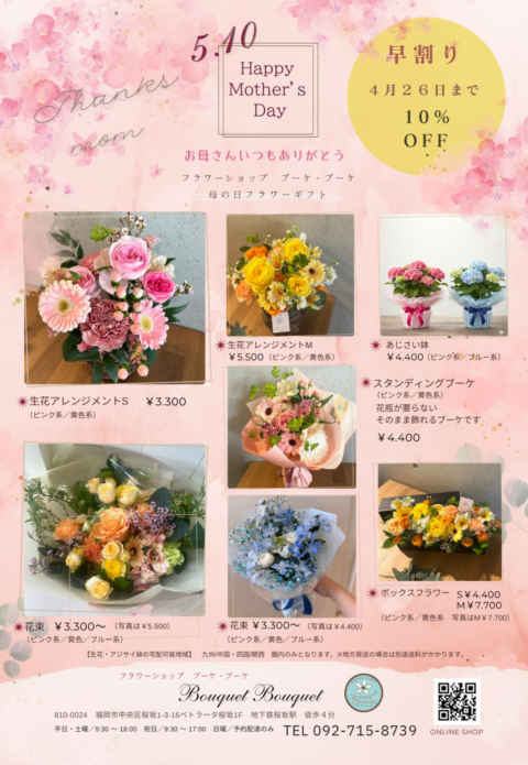 4/26まで10%割引で母の日フラワーギフトをご準備しております。